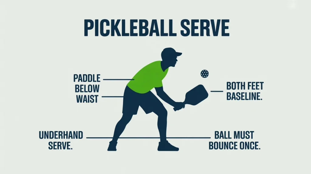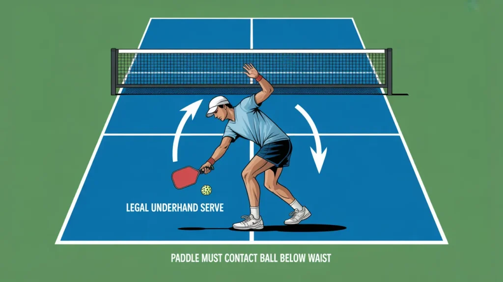 A legal pickleball serve must be underhand, with contact below the waist, and the paddle moving upward. You must also stay behind the baseline and hit into the correct service box.