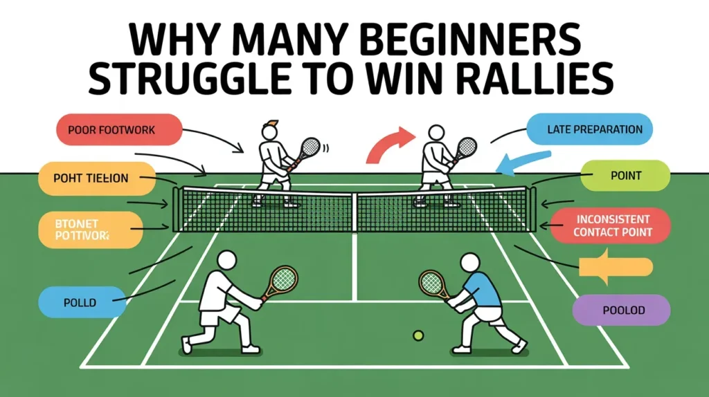 Many beginners struggle to win rallies because they focus too much on power and not enough on control. They also lack experience with positioning, patience, and shot selection during longer exchanges.