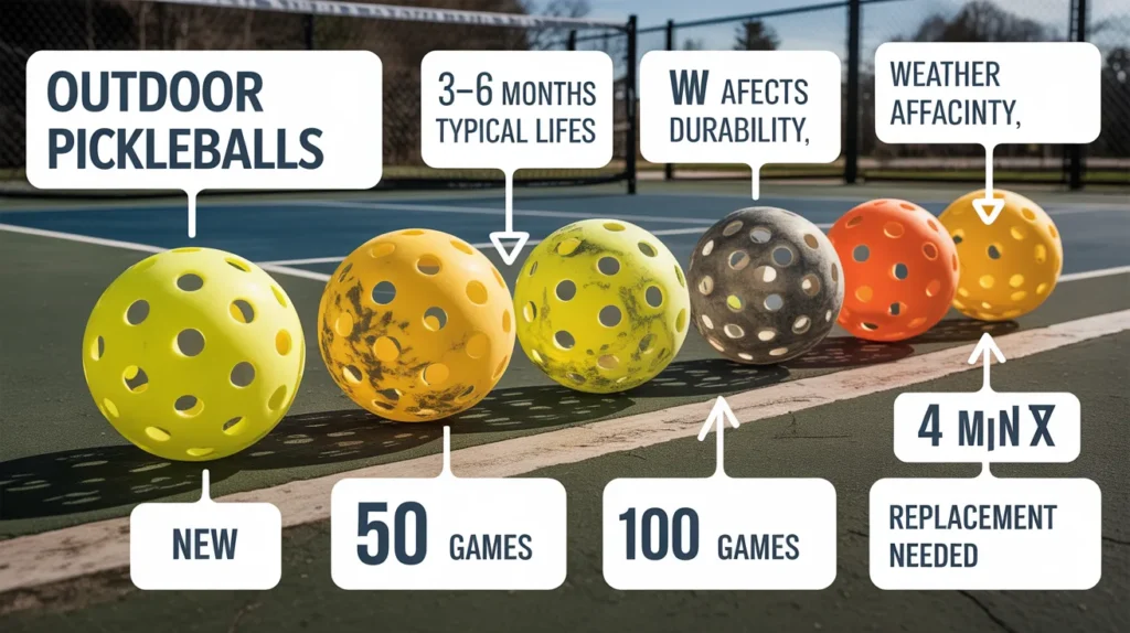 Outdoor pickleballs usually last a few games to several weeks, depending on the surface and weather.